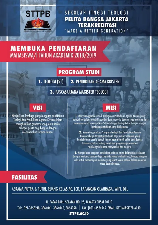 Informasi Anda berminat menimba lebih lagi pengetahuan tentang Alkitab dan rindu melayani Tuhan, bergabunglah bersama STT Pelita Bangsa Jakarta.